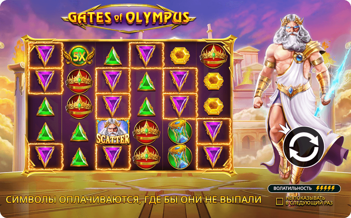 Вдохновлённый древнегреческой мифологией, слот переносит нас в чертоги самого Зевса, где на барабанах появляются драгоценные камни и золотые артефакты. В отличие от классических автоматов, здесь нет привычных линий выплат — вместо этого используется механика кластерных выигрышей, где награда начисляется за группу из восьми и более одинаковых символов, касающихся друг друга по вертикали или горизонтали. Благодаря этой особенности игровой автомат Gates of Olympus предлагает совершенно новый уровень динамики и азарта.